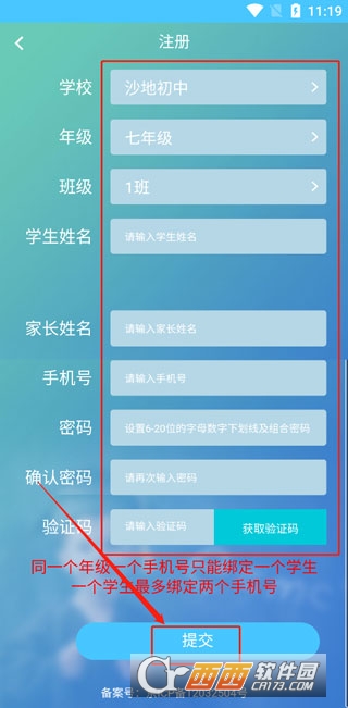 3、新用户注册,输入学生信息和家长信息,获取并输入验证码后,点击提交即可注册。