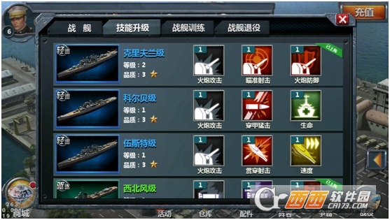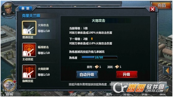 每艘舰船最多可有三个技能,其中普通攻击技能一个,主动攻击技能一个,旗舰技能一个(部分舰船无旗舰技能),所有类型的技能均可以进行升级。每个技能升级时消耗一定数量指定的道具,使用该道具后根据一定概率会有两种结果:技能升级成功、技能升级失败但熟练度增加