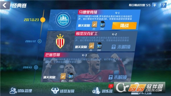 生涯赛是游戏内的第一个玩法,我们需要参加欧洲各大联赛,经过三十多轮的比赛,拿到联赛的冠军。这个玩法非常简单,在球队实力不太弱的情况下,在比赛中时刻关注对手的战术,及时切换克制对手的战术,就能轻松获得胜利。生涯赛通关到一定阶段后,就可以解锁热身赛,每天参与热身赛可以拿到给球员突破的道具。由于每天参加的次数有限制,上线后记得优先刷完强力球员突破的对应道具。等级稍有提升之后,经典赛就会解锁了,在经典赛里,我们需要扮演历史上各场经典战役的参赛球队,重现当时的比赛情景。