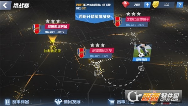 之后是排位赛,排位赛是我们跟其他玩家一决高下的比赛,战胜排名比自己高的玩家,我们的就可以上升到他所在的排名,拿到更高的排名,就可以每天获取更多的欧元,更多的宝石和更多的排位币。在排位赛中,我们无法进行操作,一切的战术指示都是按我们赛前的布置进行的。所以,我们需要观察对手的阵容,思考对手所采用的战术,在赛前就换一个能够克制他的战术。另外还有巡回赛和挑战赛,巡回赛需要派出自己的球员加入到其他球队的阵容中参加各地的商业赛;挑战赛每天都有15个关卡,我们要按照关卡条件去完成比赛,才能拿到最丰厚的奖励,否则我们仅仅只能通关。