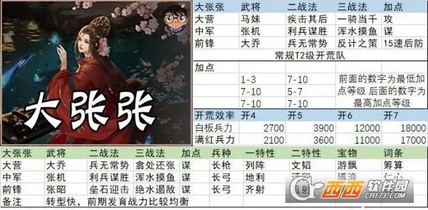 今年3月起,开始流行一支攻守兼备的队伍,大张张,优点数不胜数,但单以开荒角度来说,吃红,战法经验需求多,都是无法避免的缺点,因此我将其排到了