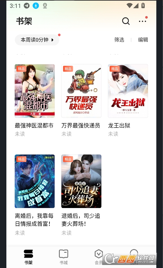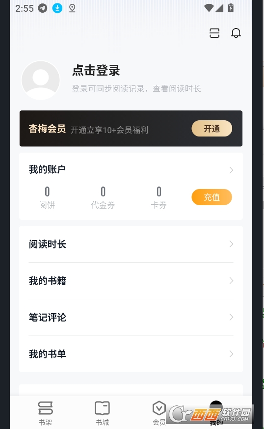 在西西下载该软件后,点击进入的是书架功能,你可以把没看完的书籍放入书架