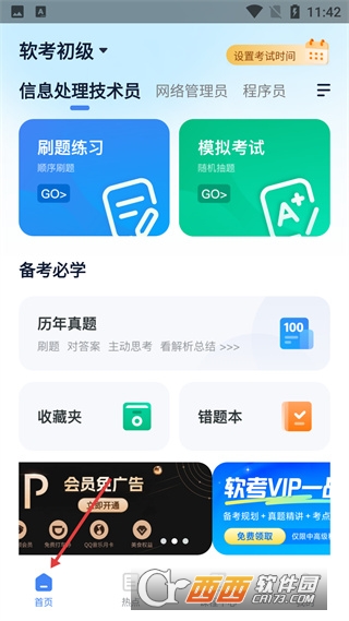 2、首页展示软考初级分类,有刷题练习、模拟考试等功能,还有历年真题、收藏夹等备考板块,底部是首页入口。