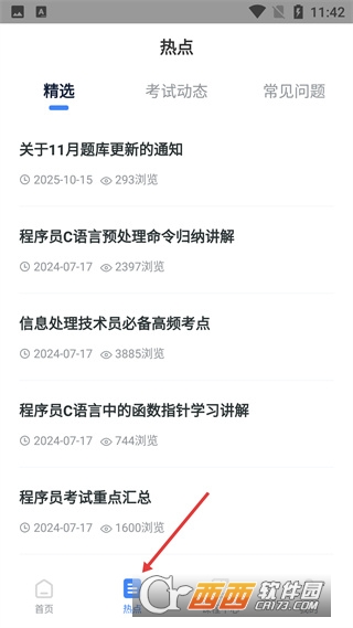 3、热点页有精选、考试动态等分类,展示题库更新通知、程序员考点讲解等热点资讯,底部是热点入口。
