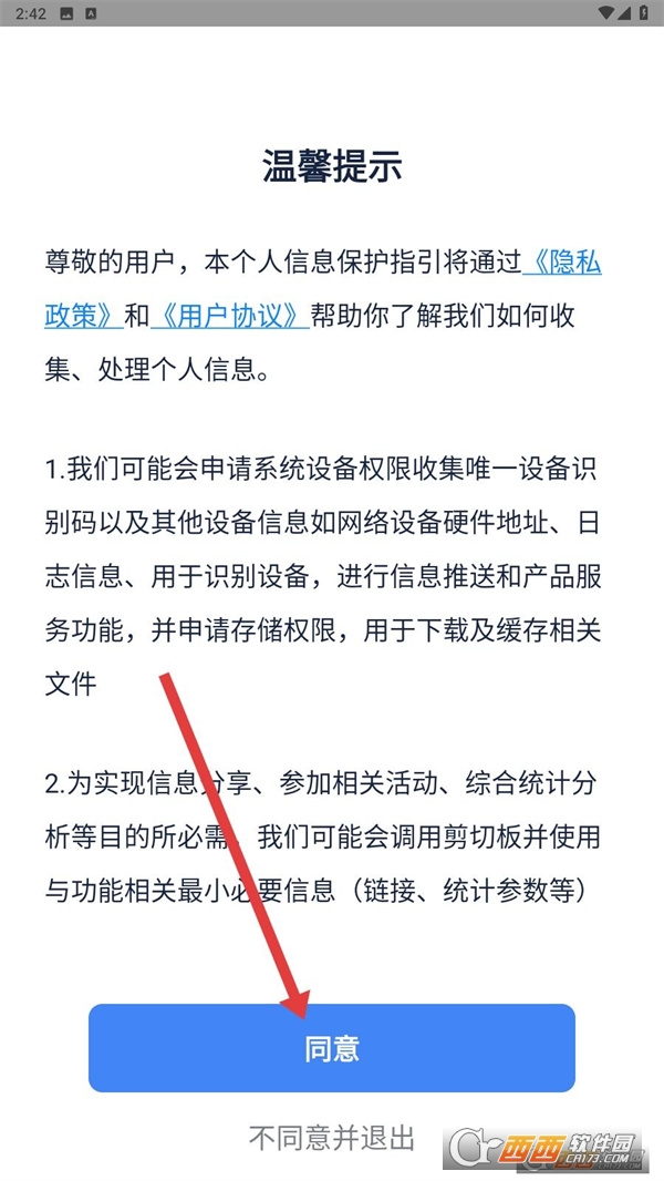 1、第一次打开软件,页面会跳出服务协议等,需要认真阅读软件给出的条款后,点击同意并继续下一步。