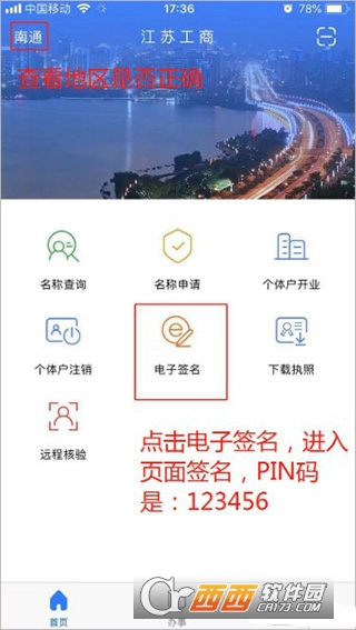5、人脸识别完成后,我们查看首页左上角地区,是否是我们注册公司所在地区,如果不正确,点击切换地区。然后点击电子签名,进入签名页面,输入PIN码默认是123456