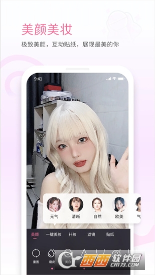 美颜美妆强大:实时直播也能拥有最美颜值,新增五官微整、一键美妆、细节补妆、美肤滤镜、互动贴纸等超100种美颜效果。
