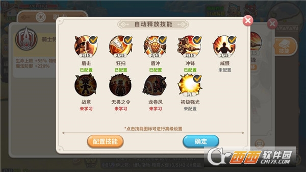 除了进行技能升级外,在选项窗口的左下方,还可以进行“配置技能”和“自动战斗”的调整。