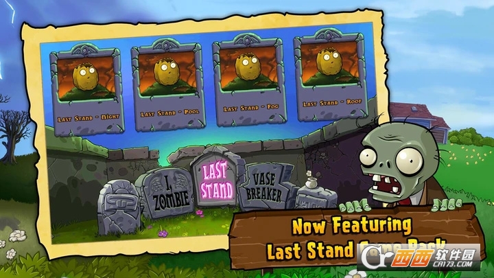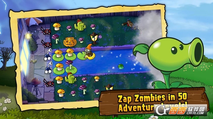 ● 多达50个的冒险模式关卡设定,从白天到夜晚,从天台到游泳池,场景变化多样。