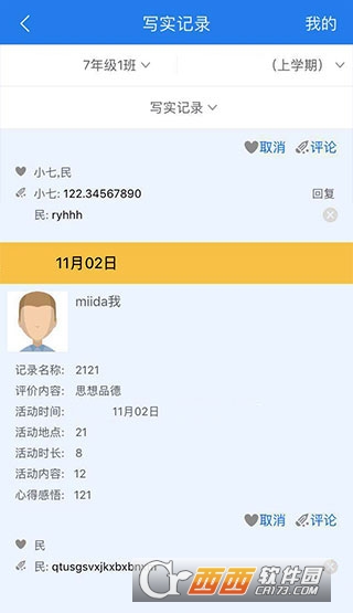1、登录学生账号,首页点击“写实记录”,点击右上角“我的”。