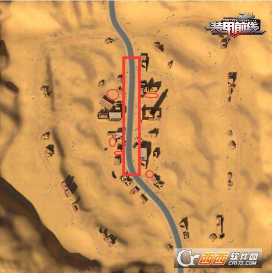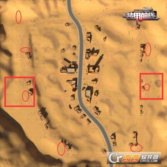 地图选用的是一张沙漠地图,比较符合现代战争的风格。地图两边是高坡,给步战车以及八轮突击炮提供了不错的侦查以及黑枪的位置。用方块圈出的位置如果可以抢下来,那么不管是视野还是火力压制都有着明显的优势。圆圈都是一些黑枪的点位。