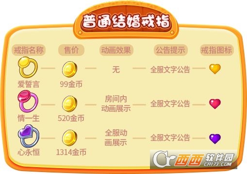 1、普通结婚戒指:所有玩家都可以使用的结婚戒指
