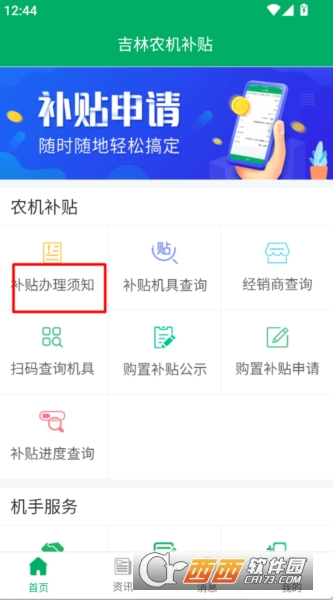1、打开已下载并成功登录的吉林农机补贴App,进入首页后点击“补贴办理须知”,了解政策信息和申报条件。