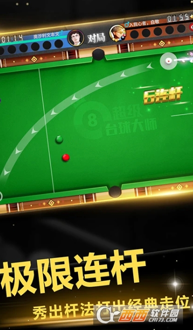 《超级台球大师》是一款真人实时对战桌球游戏,还原现实桌球玩法-8球与斯诺克,简单流行的操作方式,绚丽的动画特效,配以真实的物理参数,精准的进球,激动人心的赛事,究竟谁才是冠军?让我们拭目以待。