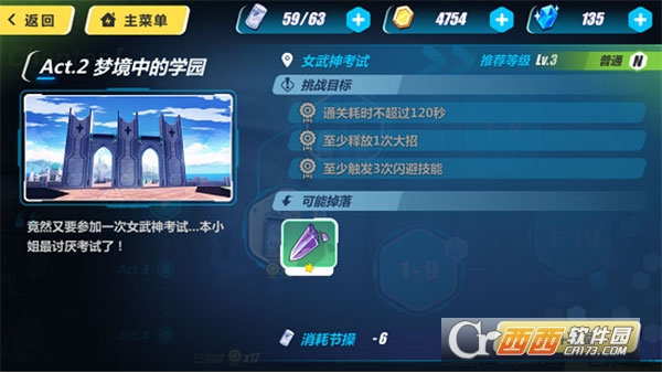 1、点击进入之后,我们可以看到每一关的挑战目标以及可能掉落的装备,另外需要提到的是,每次进入都需要消耗我们的体(节)力(操)哦。