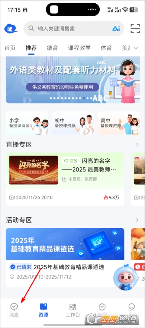 1、打开智慧教育平台app,进入后点击左下角“消息”;