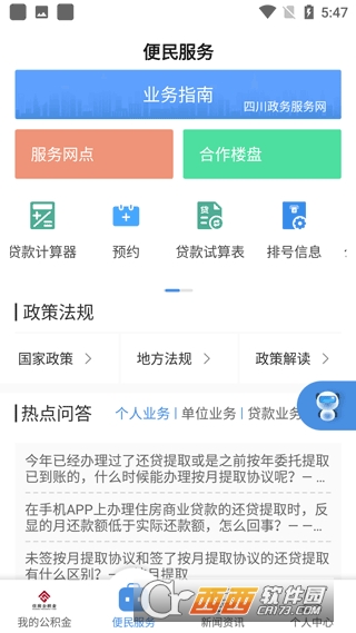 『便民服务』业务指南、服务网点、合作楼盘、政策法规、热点问答,还有多种便民工具供您使用。