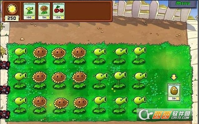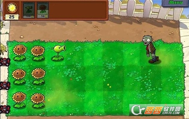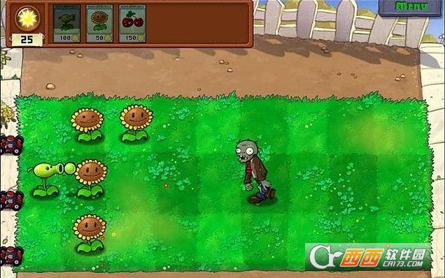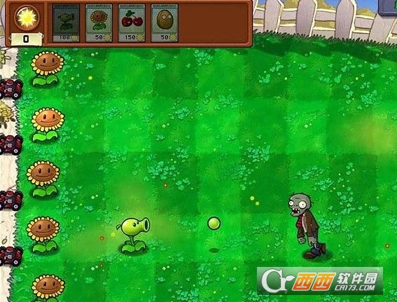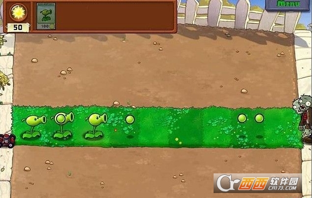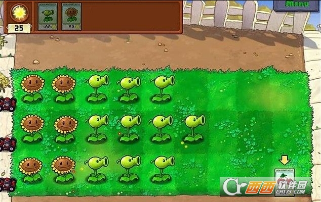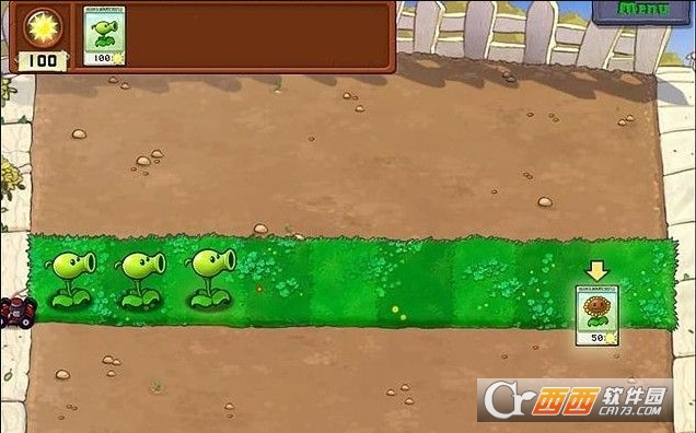 此关属于教程关,僵尸来路只有1条。收集太阳并种好豌豆射手就可以了,不过别把豌豆射手种在右边僵尸出现的地方自杀就可以轻松过关。