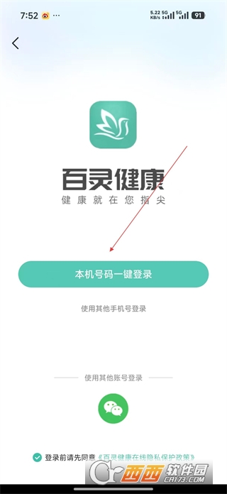 1、打开百灵健康软件,进入登录页面,勾选同意隐私保护政策,选择本机号码一键登录方式,完成账号登录。