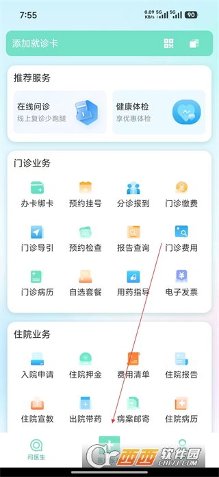 2、在问医生页面点击医疗服务选项,进入医疗服务页面,浏览推荐服务及门诊住院等各类业务功能。