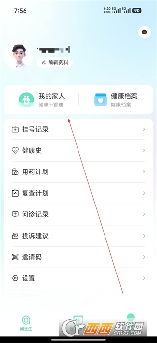 4、切换至我的板块进入个人中心页面,查看挂号记录健康史等个人相关信息,找到我的家人选项,准备进行健康卡管理。