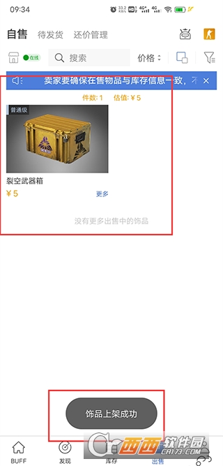 4、上架成功后,可在出售界面中看到自己上架的物品。