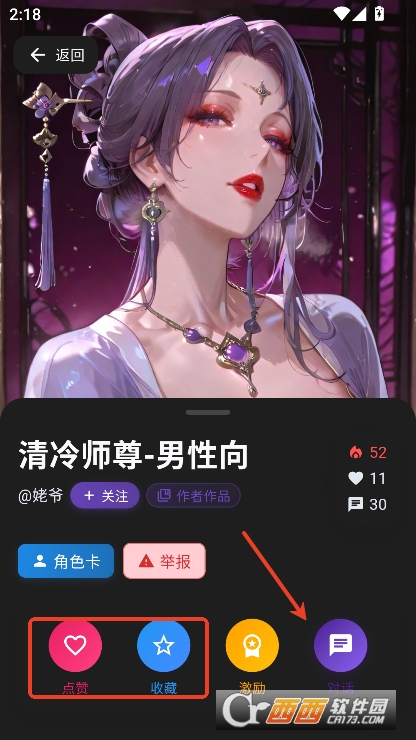 3,点击角色就能查看其背景简介,点赞收藏与开启对话