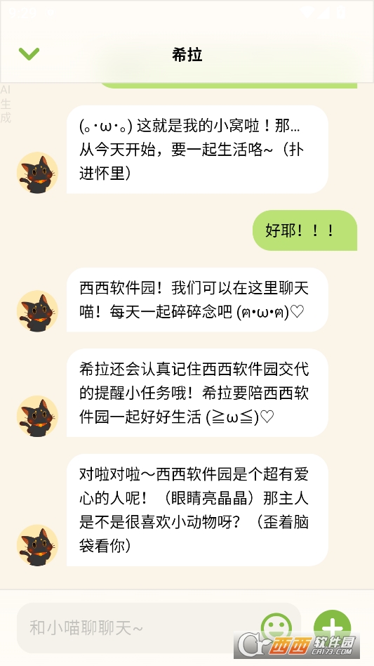 最大亮点就是“真实生命感的陪伴设定”,打破了传统虚拟角色的冰冷感。小喵希拉不会机械地回答问题,而是有自己的“小情绪”,比如你很久没理她,她会说“希拉好想你呀”;你跟她说开心的事,她会用“哇!好棒呀~”的语气回应,这种有温度的互动,就像真的有一只小猫在身边依赖你。