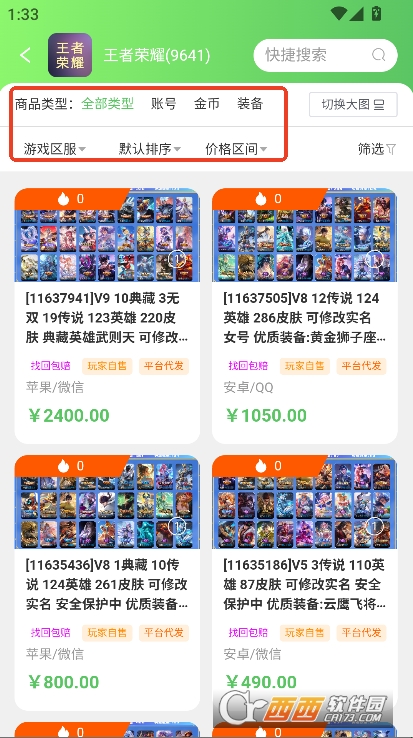 2,按照主商品类型,区服价格等条件进行排序