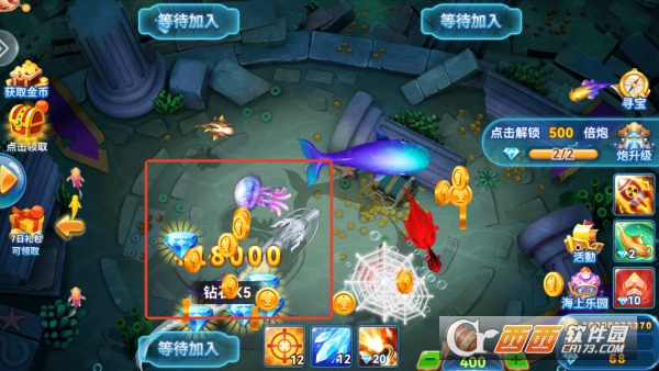 特色道具辅助玩法:游戏内拥有丰富多样的道具,为捕鱼增添更多策略性与趣味性。比如冰冻道具,使用后可在短时间内冻结屏幕内所有鱼类,使其动弹不得,此时玩家发射炮弹,捕获成功率大幅提升,适合在鱼群密集且有高价值鱼出现时使用