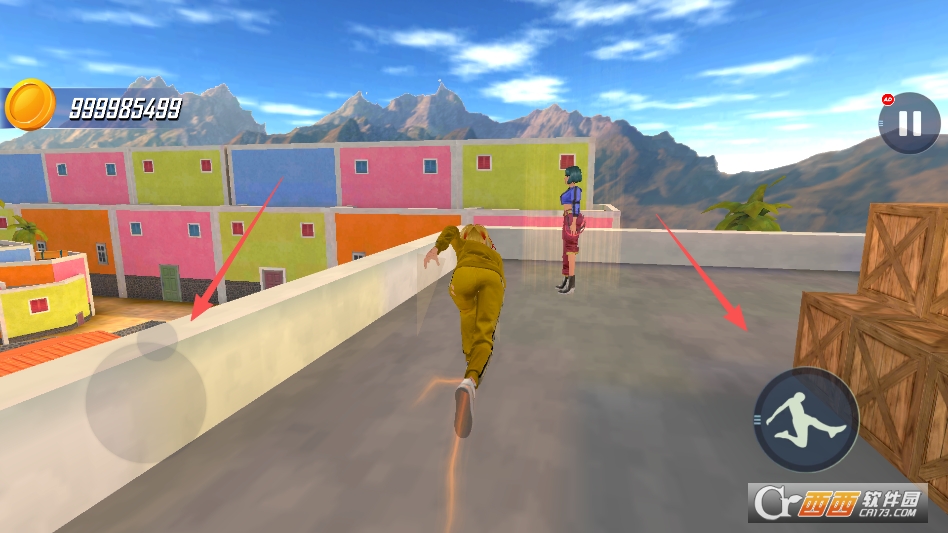 第一个核心玩法是“无尽屋顶跑酷+多样挑战”,游戏没有固定的关卡终点,是无尽跑酷模式,但每一段路程都会面临不同的挑战。比如前一段可能是平坦的屋顶,只需要控制奔跑和跳跃;下一段就可能出现高低错落的屋顶,需要频繁攀爬;有时候还会遇到屋顶上的障碍物,比如空调外机、广告牌,得及时躲避。每一刻都有新挑战,不会觉得单调。