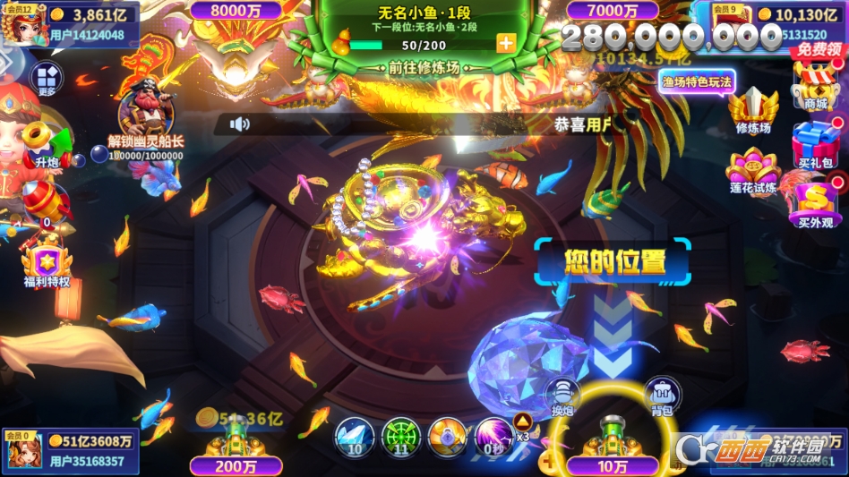 “多倍率炮台自由切换,玩法灵活不单调”也很突出。玩家可以根据自己的分数情况随时换炮台,比如刚开始分数少,用10倍炮台慢慢攒;分数多了,换成100倍炮台冲高分,不用局限在一种玩法里。而且炮台还有不同的外观皮肤,解锁后能换着用,比如酷炫的火焰炮台、可爱的卡通炮台,既实用又能满足个性化需求。