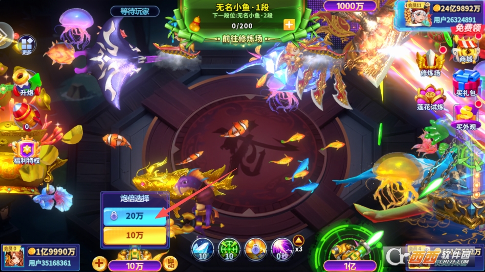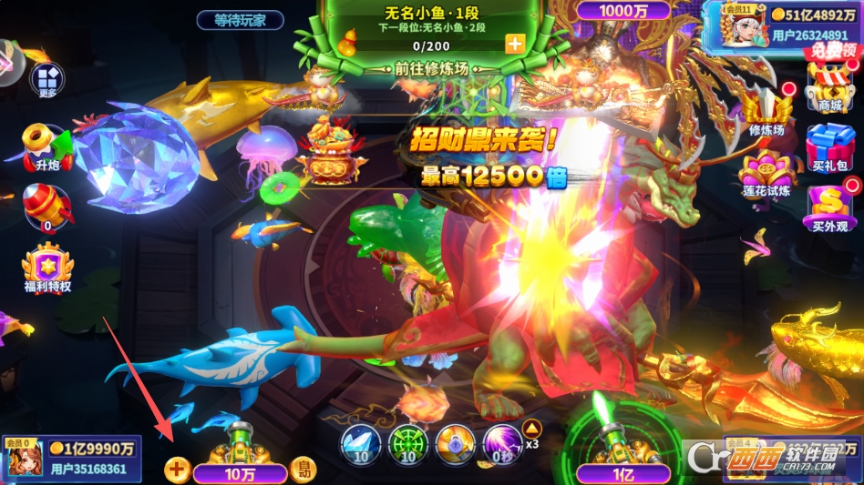 还有不同倍率的炮台供玩家自由选,想稳一点玩就选低倍率炮台,比如10倍、20倍,炮弹消耗少,适合慢慢攒分数;想挑战高收益就选高倍率炮台,比如100倍、200倍,捕到大鱼能赢更多分数,不管是佛系玩家还是喜欢刺激的玩家,玩法特别多样化。