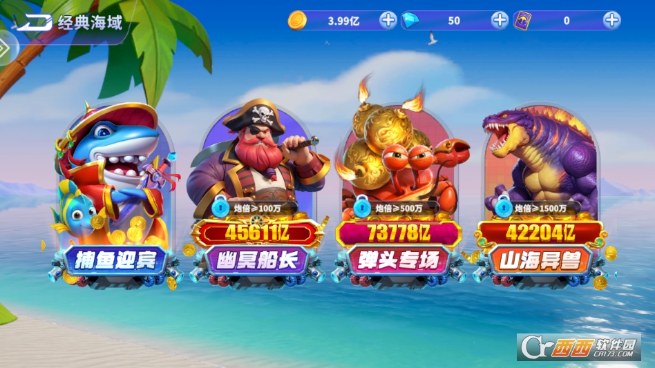 第一个主打玩法是“经典模式”,还原最纯粹的街机捕鱼体验。进入模式后,没有复杂的任务,就是单纯的捕鱼攒分数。屏幕里会不断刷新鱼群,不同鱼对应不同分数,比如捕到小丑鱼得10分,捕到鲨鱼得100分。玩家选好炮台倍率,瞄准鱼群发射炮弹就行,捕到鱼就能获得对应分数,分数积累到一定程度还能解锁新炮台,适合喜欢佛系捕鱼的玩家。