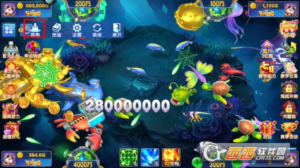 1、深海捕鱼核心玩法,玩家操控炮台瞄准深海鱼类发射渔网,不同鱼类对应不同分值,捕获特殊目标(如巨型BOSS鱼)可获得高额奖励,支持调整炮台威力,优化捕鱼策略。
