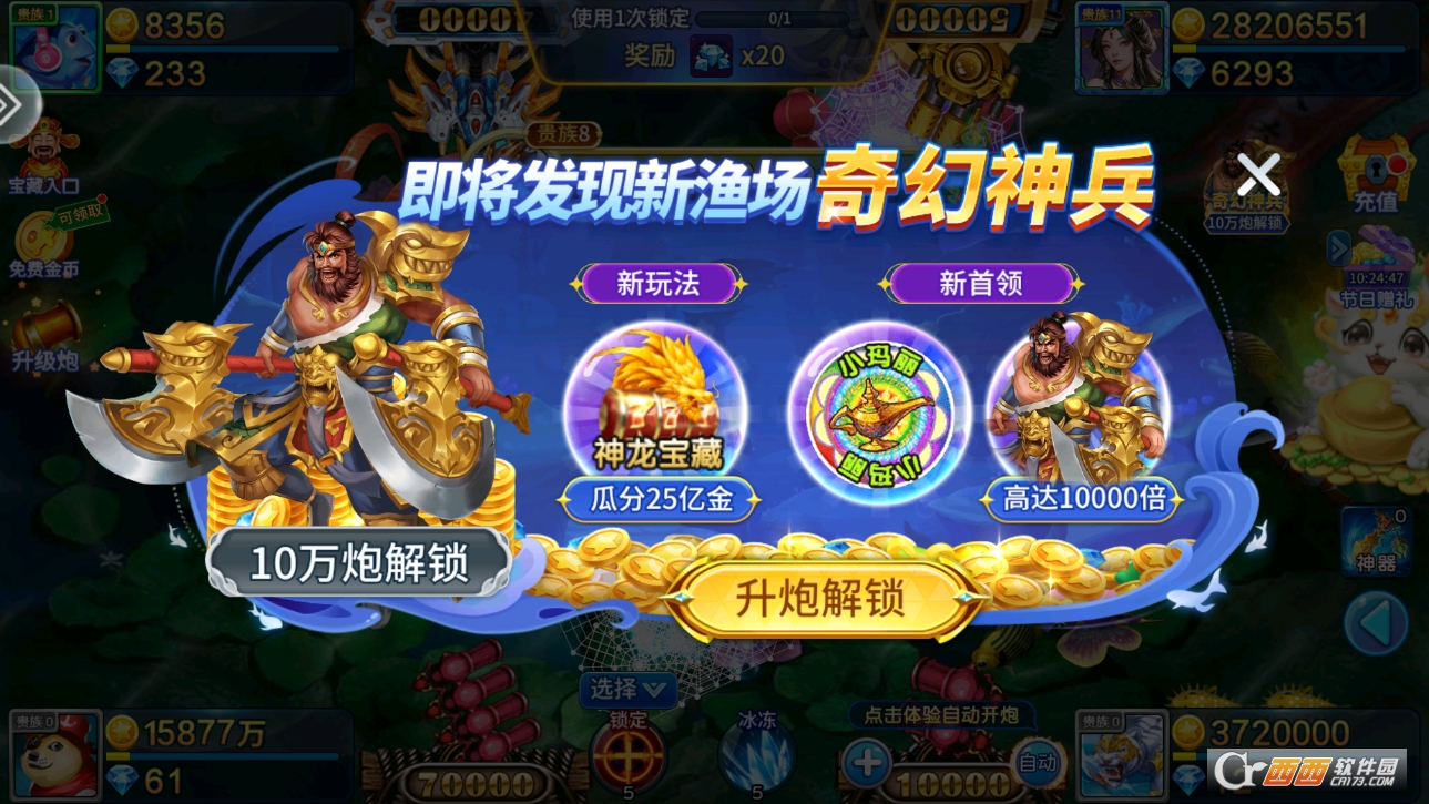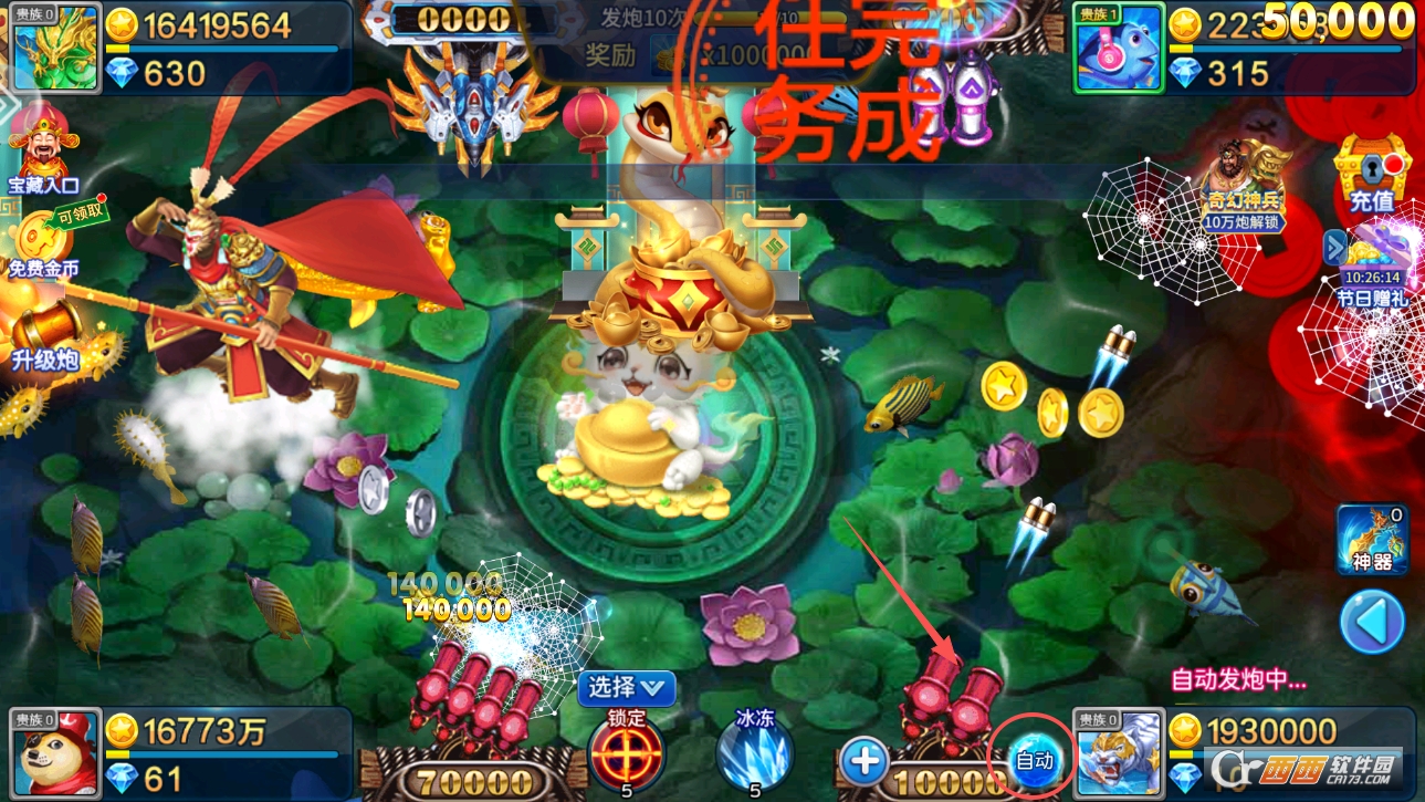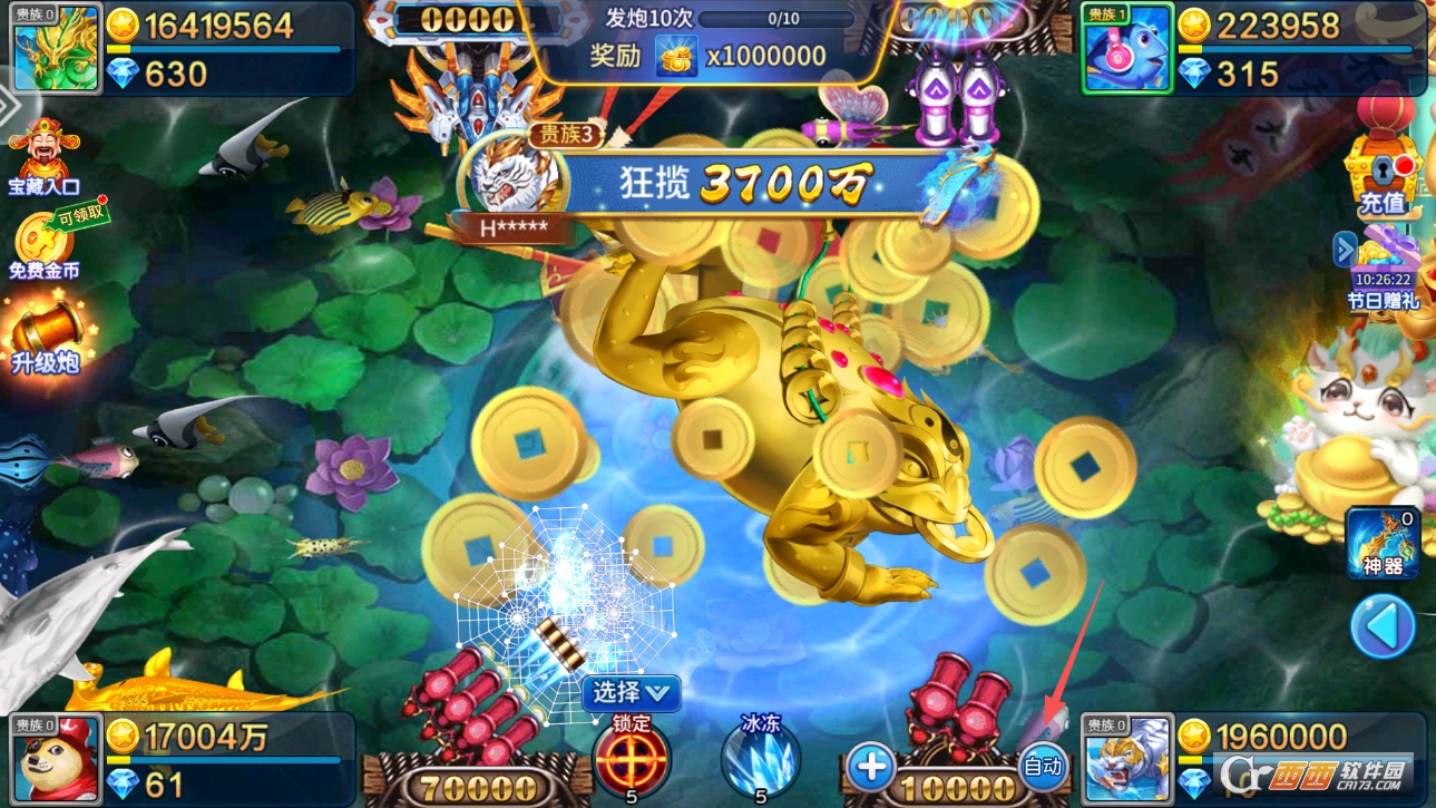 第一个核心玩法是“操控炮台捕鱼,积累积分换奖励”。选好炮台倍率后,瞄准海底的海洋生物发射炮弹,击中不同的鱼能获得不同积分。积分越多,能兑换的话费奖励越丰厚,也能解锁更高倍率的炮台,倍率越高,击中高价值鱼后的积分涨得越快,形成良性循环,玩着有目标感。
