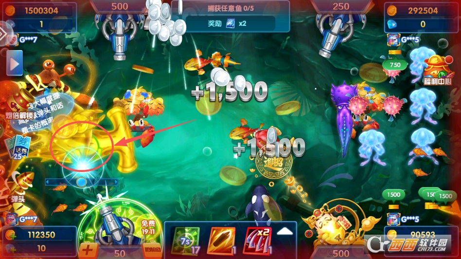 第一个主打玩法是“竞技捕鱼比拼,实时对决超刺激”。玩家可以进入不同难度的竞技场次,和其他真实玩家同屏捕鱼,大家共享鱼群和boss,谁先击中鱼就能获得对应积分。游戏过程中能实时看到其他玩家的积分排名,最后排名靠前的玩家能拿到额外的积分奖励,比拼感十足,玩起来有明确目标。
