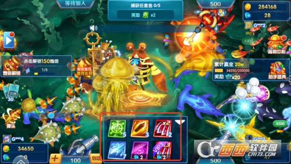 玩家操控炮台捕超13种海洋生物,变卖得金币,还可挑战两类 BOSS:海域专属 BOSS(如巨爪章鱼)秒杀全屏,众神战场BOSS(如火焰神龙)最高爆赢20万倍,捕获冰霜鱼等功能鱼能触发全屏轰炸清理鱼群。
