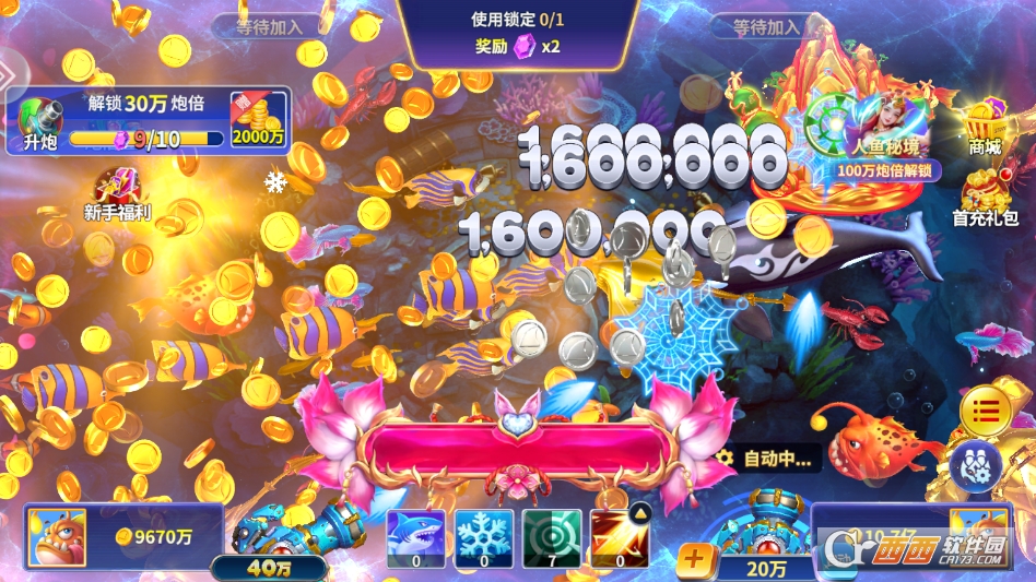 第一个主要玩法是“自由切换炮级,瞄准捕鱼赚金币”。核心玩法就是通过调整炮的等级捕捉鱼类,低等级炮适合打小鱼攒金币,高等级炮能打大鱼但消耗更高。手指点击屏幕确定方向,松开就会发射渔网,捕到鱼就能获得对应的金币奖励,金币可以用来升级炮级或解锁新渔场,循环往复越玩越有动力。