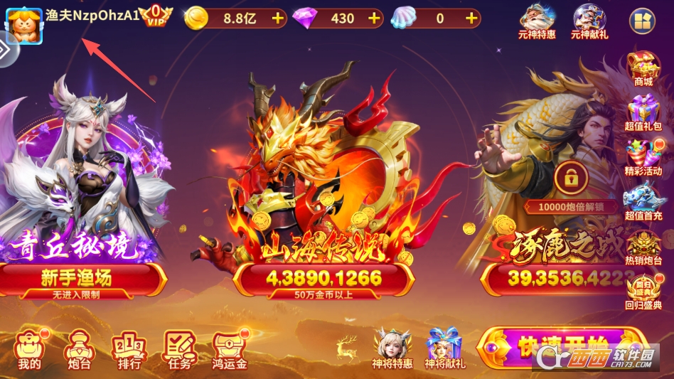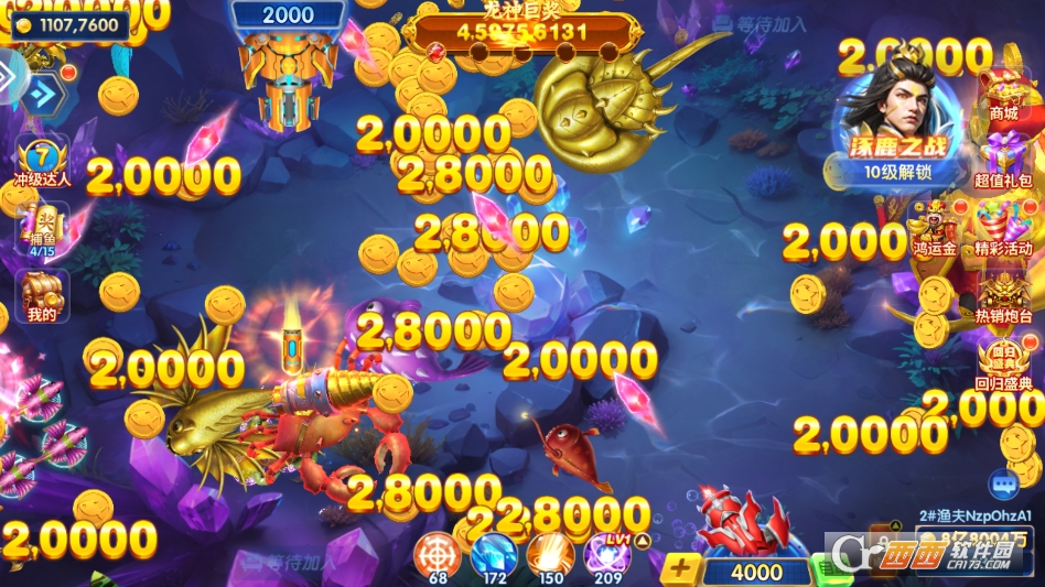 第一个主打玩法是“千炮自由调节,捕获效率随心控”。炮台倍数从10倍到1000倍都能选,新手可以用低倍炮练手,熟悉后换高倍炮冲高分;高倍炮威力大,更容易击中大Boss鱼,触发暴击的概率也更高,不过消耗的炮弹积分也多,能根据自己的技术和积分情况灵活调整,玩法更灵活。
