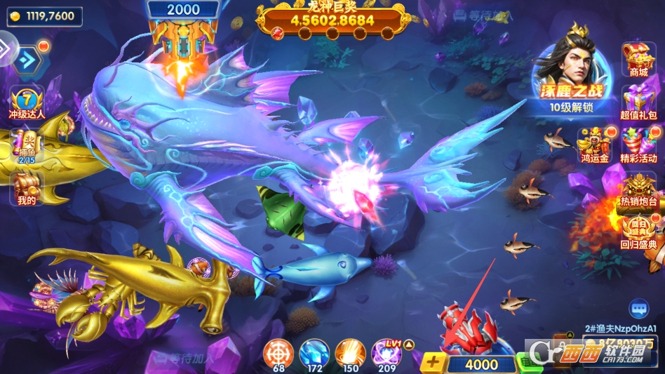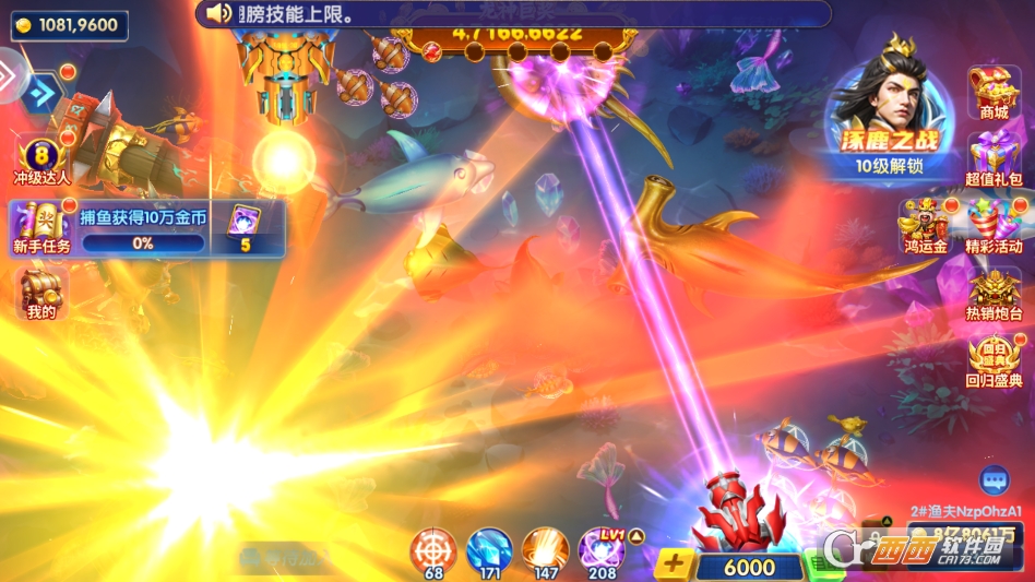 第一个主要玩法是“千炮万炮自由切换,捕鱼效率随心控”。炮台倍数从10倍到10000倍都能选,新手先用低倍炮练手,熟悉鱼群规律后再开高倍炮冲分;万倍炮虽然消耗炮弹多,但击中Boss鱼能赚几万甚至几十万积分,想快速攒积分换话费,就得多用高倍炮挑战,玩法灵活不单调。