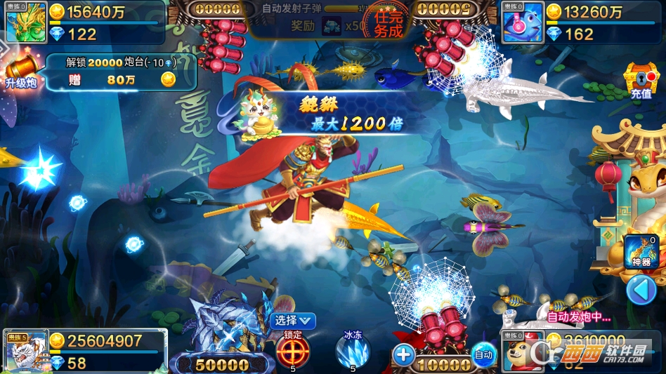还有经典的“特殊鱼触发奖励”玩法,增加爽感。游戏里有带特殊效果的鱼,比如击中“闪电鱼”会触发范围攻击,一次性捕到周围的鱼;击中“冰冻鱼”能冻住屏幕里的鱼,让你慢慢捕。这些特殊鱼和高上限炮台搭配,能打出翻倍收益,玩起来更刺激。