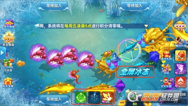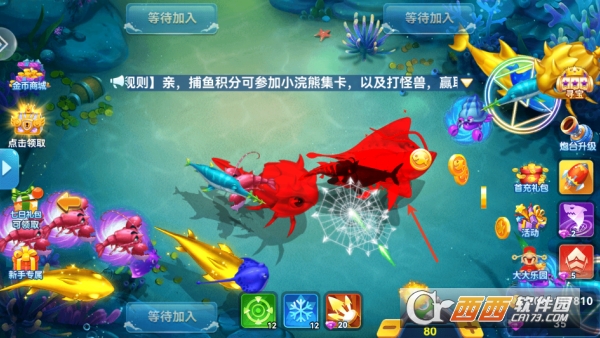 道具与爆率把控:渔网道具适合聚集鱼群,追踪导弹针对灵活鱼类,BOSS出现时搭配冰封(冻结全场)+狂暴(双倍效率)技能组合;留意游戏内爆率波动提示,高爆率时段加大攻击力度,同时控制炮弹发射频率,避免盲目消耗金币。
