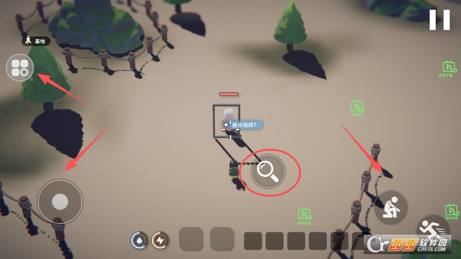 左侧上方打开背包,左侧控制移动,右侧控制行动,接近互动物即可进行互动