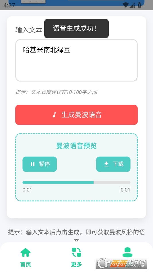 曼波语音生成这软件也太有意思了!它主打的就是输入文字,就能生成曼波小马风格的语音,而且这语音调调,就是网上超火的哈基米小视频里那种,软萌又可爱,一听就特别有那味儿。