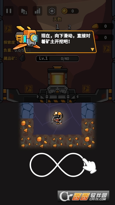 挖掘与资源循环:通过点击屏幕或虚拟摇杆控制角色挖掘,收集黄金、钻石、煤矿等矿物资源,将资源出售兑换金币,再用金币升级钻头、背包、燃料等工具,形成挖掘→卖资源→升级→高效挖掘的闭环,同时需持续向下解锁新地层,推进挖穿地球目标。