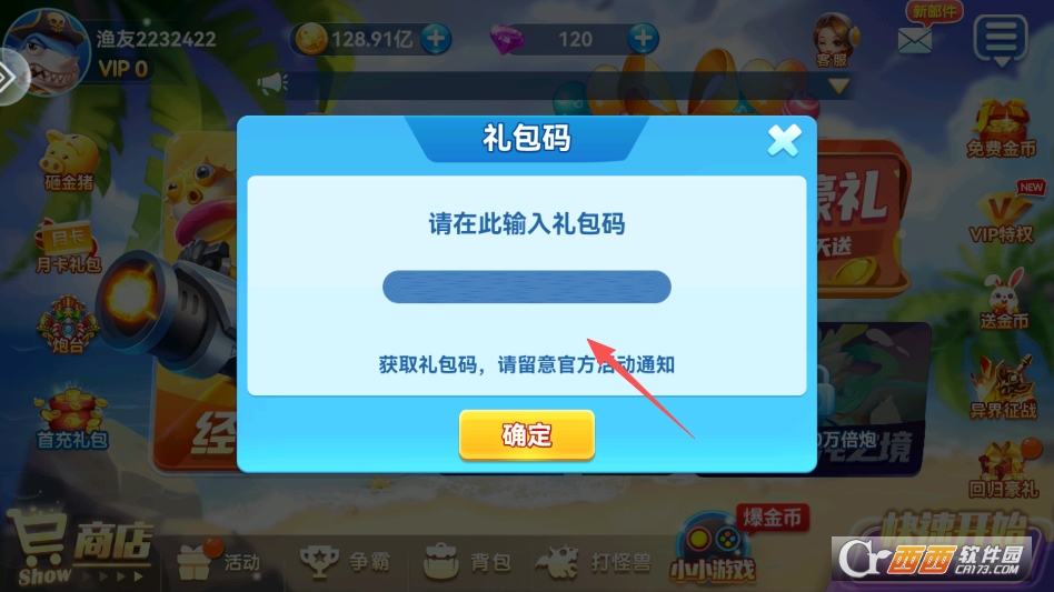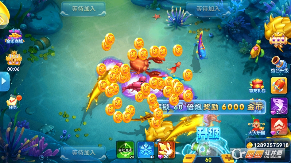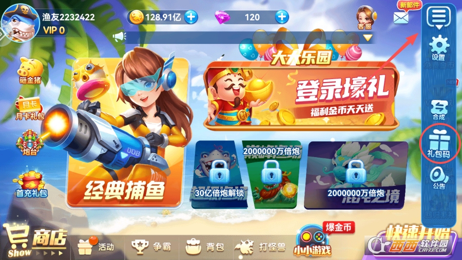 第一个主打玩法是“福利登录捕鱼”,开局超轻松。刚登录游戏,系统就会自动送海量金币和道具,比如初级炮台、小范围轰炸技能,有了这些资源,不用慢慢攒,直接就能进竞技场开炮捕鱼,新手也能快速体验到爆装的爽感。