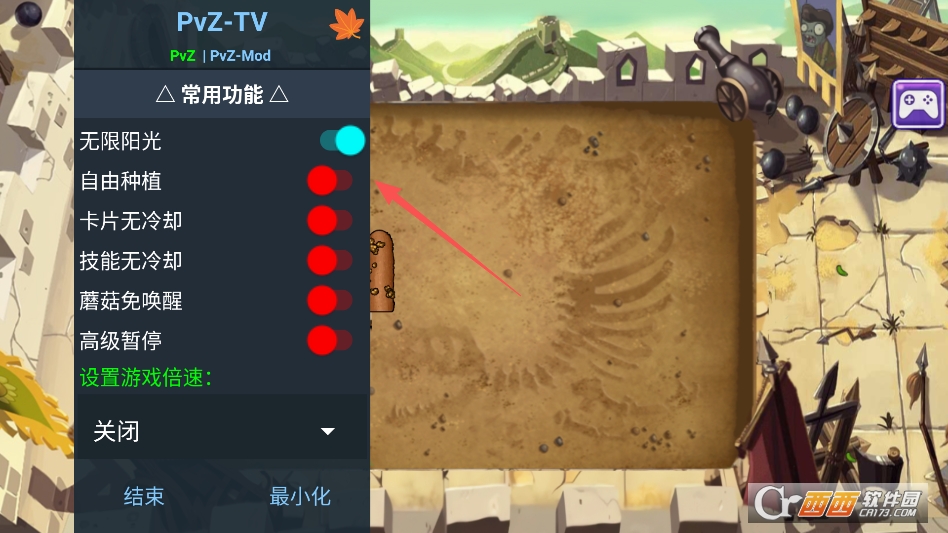 作弊功能操作简单,打开菜单就能用。在游戏主界面或关卡中,点击屏幕角落的“内置菜单”按钮,就能看到所有作弊功能,想开启哪个就点击对应的开关,不用复杂设置。开启后功能立即生效,比如打开“无限阳光”,阳光数值会直接拉满,种植物时完全不用顾虑,玩起来特别省心。
