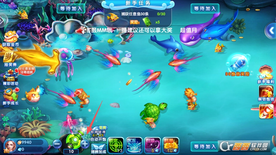 进入渔场开始游戏之后找到自己的炮台,点击炮台右侧的+号按钮