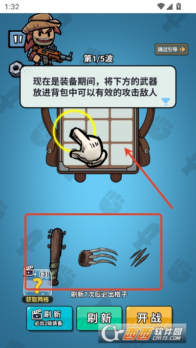 背包武器管理与合成战斗:进入关卡后需将初始武器放入背包格子,相同等级武器可合并升级,点击刷新可获取新武器;配置完成后点击 “开战”,角色自动使用背包武器攻击敌人,无需手动操作,战斗需完成指定波次敌人击杀,部分关卡需击败最终BOSS。